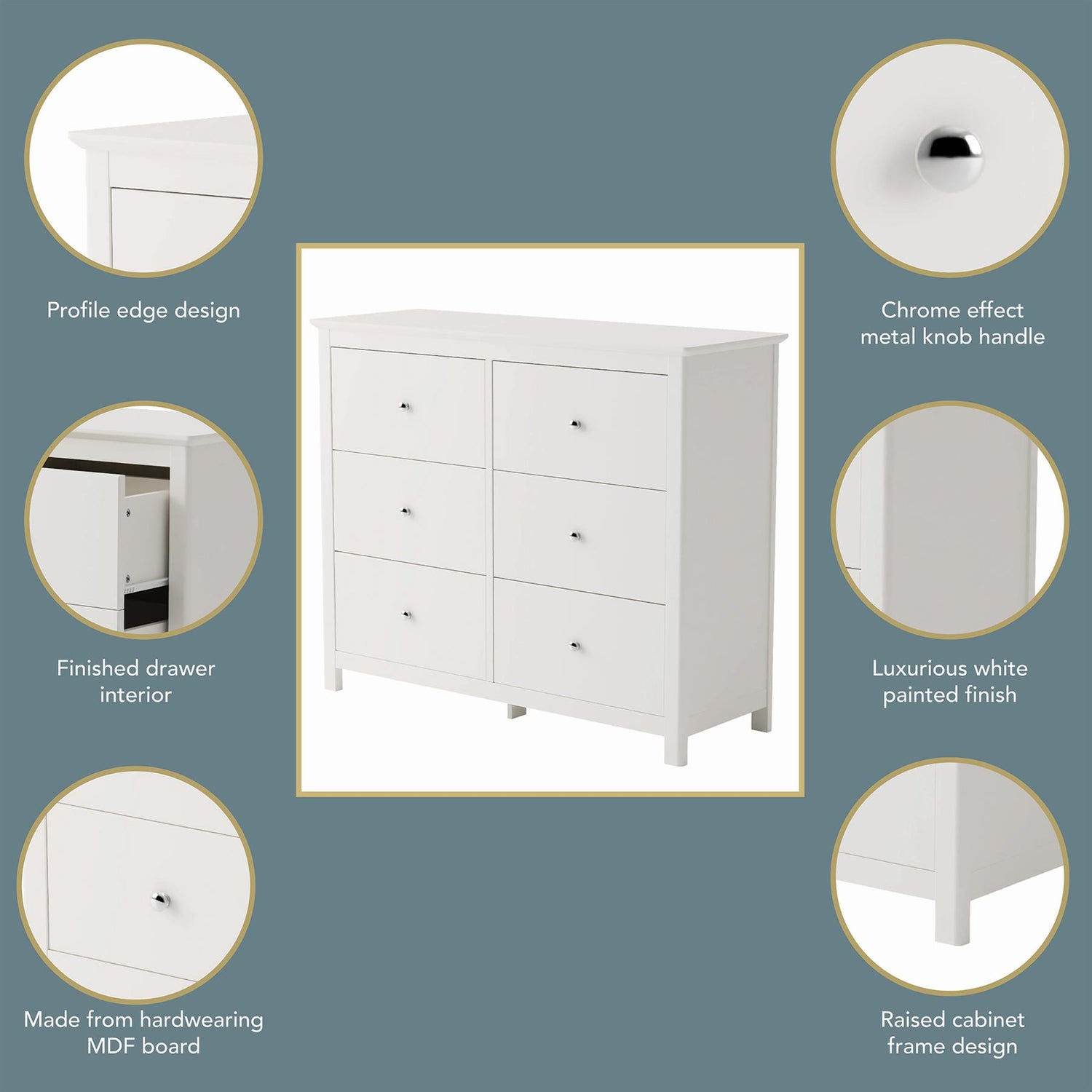 Add a touch of luxury to your bedroom with this stylish Nairn 3 plus 3 drawer double wide chest. Designed to optimise space and yet provide ample storage, there are two rows of 3 generous full width drawers which provide lots more storage for you. There is plenty of room on top for a TV, lamp or pictures and its even ideal for use as a dressing table. The really subtle deep white painted finish emphasises the soft rounded corners of the legs and top, finished off with real metal polished steel effect handles, altogether these features create a calming effect to your bedroom.