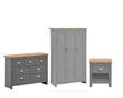 Full of presence, the Lincoln range in Light Grey and cascading Oak tops fills any room with warmth and comfort. This bedroom set consists of a 3 door double wardrobe, chest of 3+4 drawers and 1 drawer bedside table.