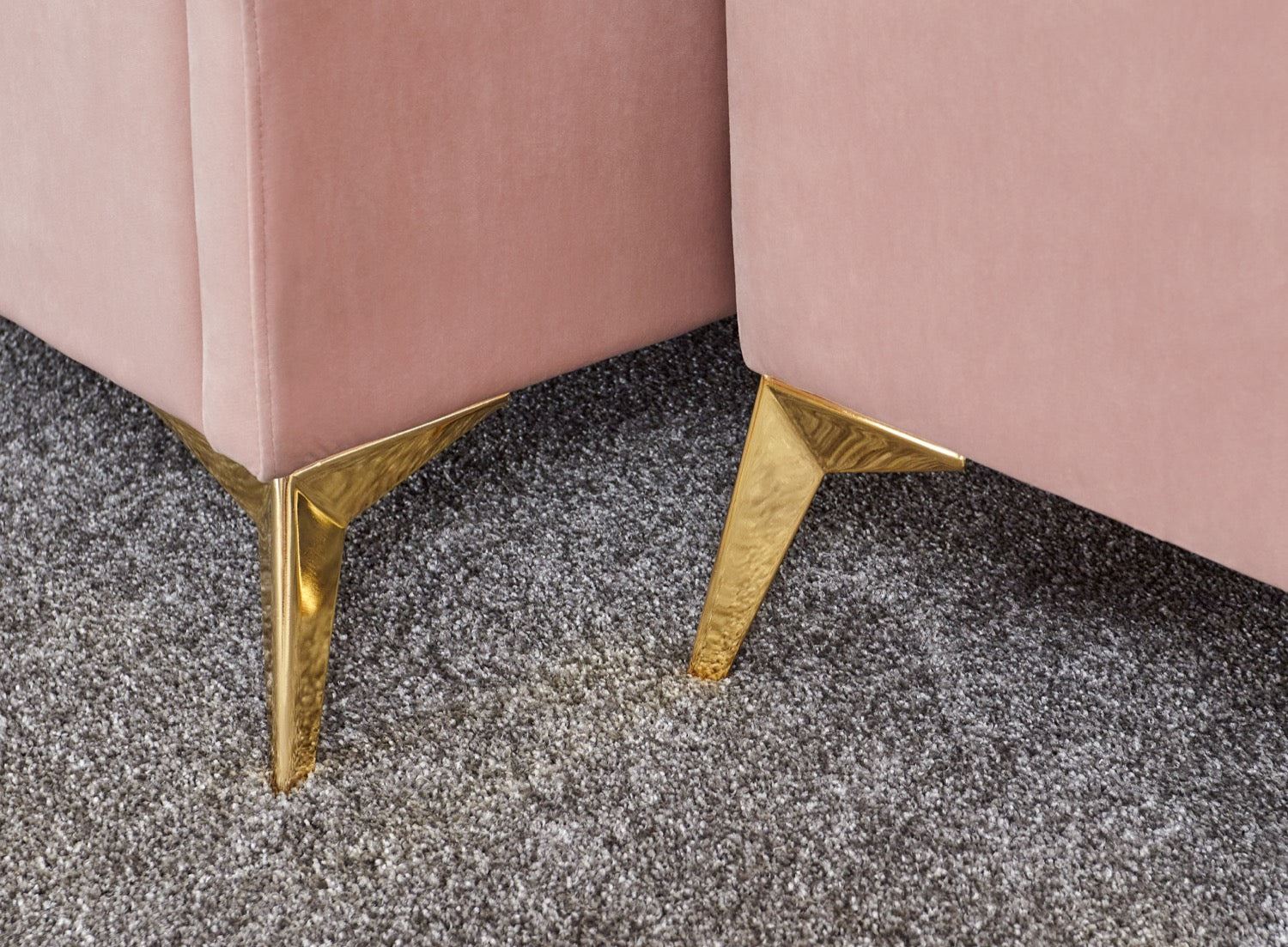 Give an underused window bay - or other bedroom nook - an eye-catching feature with this gloriously elegant window seat. The gently flared arms feature a classic sculpted design and flank a comfortable seat beneath which is concealed a useful lined storage compartment - perfect for blankets and throws. The deep padded frame and seat is upholstered in a tactile plush fabric with a matt velvet pile that looks and feels wonderfully indulgent. The angled gold-effect metal legs add a contemporary contrast to the seat's classic lines. Pick from blush pink and soft grey colourways.
