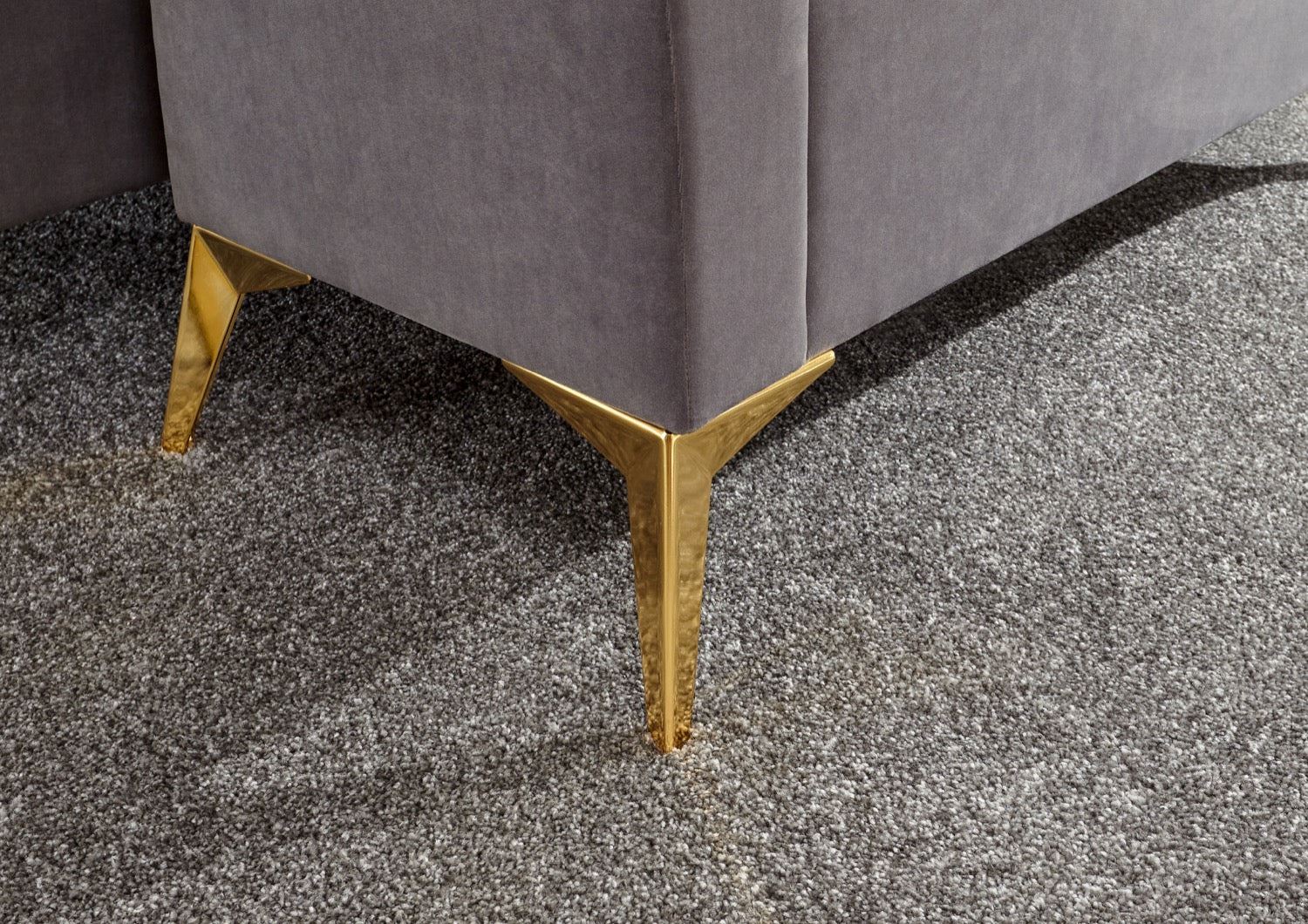 Give an underused window bay - or other bedroom nook - an eye-catching feature with this gloriously elegant Pettine Ottoman Storage Bench. The gently flared arms feature a classic sculpted design and flank a comfortable seat beneath which is concealed a useful lined storage compartment - perfect for blankets and throws. The deep padded frame and seat is upholstered in a tactile plush fabric with a matt velvet pile that looks and feels wonderfully indulgent. The angled gold-effect metal legs add a contemporary contrast to the seat's classic lines. Pick from blush pink and soft grey colourways.