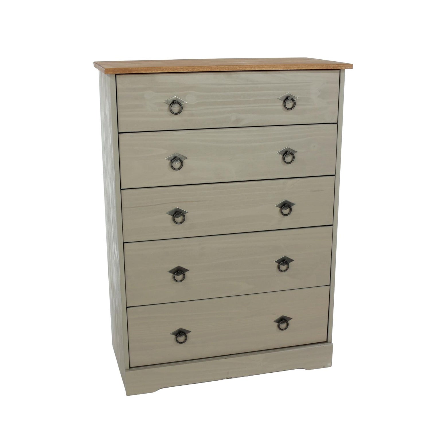 Our Classic Corona Style 5 Drawer Chest is an Ideal choice for those of us who appreciate real wood. With 5 useful size drawers it offers ample storage space too. Its styling features a grooved plank effect top with an Antique waxed effect finish which emphasises the natural graining of the natural pine. the cabinet is also made of real wood which is coated with a subtle Grey washed wax finish with stunning gunmetal diamond shaped dropleaf handles. Drawer bases and cabinet backs are made from real wooden hardboard for added strength and stability so you can enjoy using your furniture to its utmost.