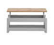 Lift up top with hidden storage area; Grey with contrasting; Oak effect top; 30mm chunky table top; Measures H42cm x W105cm x D52cm; Other matching items available