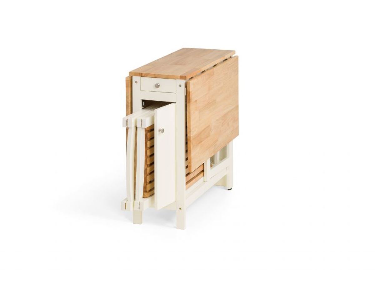 A neat and functional, space saving dining set where the chairs can be folded and stored Inside the table. This dining set is a timeless classic that features a integrated storage drawer, perfect for small spaces with less storage.
