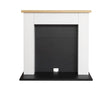 -Pure white surround with oak shelf. - Black granite effect back panel & hearth. - Stove pipe included.