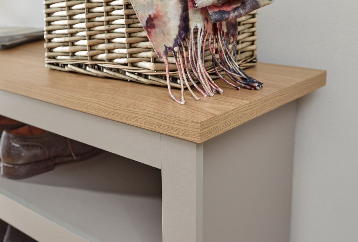 Give your hallway clutter the heave-ho with this superbly stylish Lancaster shoe cabinet. The sturdy construction incorporates two tiers of shelving - enough for at least eight pairs of standard-sized men's shoes or ankle boots. A chunky base - in grey, cream or slate blue finishes - is partnered with a squared-off 25mm oak-effect top, making it a good match for period and contemporary interiors alike. Stack shoes underneath and leave the top free for bags, phones and car keys, or adorn with a plant or lamp. A top choice for busy hallways - now there's no excuse for a shoe mountain!