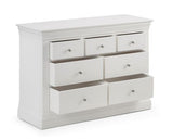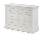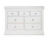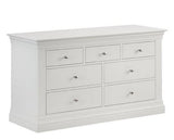 Finished in a striking white lacquer; Elegant French design, suitable for both contemporary or traditional decor.Crafted from Pine and MDF with brushed steel handles.Featuring 3 small and 4 large drawers, perfect for storing your clothing;