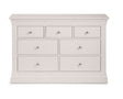 Finished in a striking light grey; Elegant French design, suitable for both contemporary or traditional decor. Crafted from Pine and MDF with brushed steel handles. Featuring 3 small and 4 large drawers, perfect for storing your clothing;