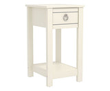 The Clovelly Ivory 1 Drawer Bedside Table has an efficient design from long-lasting engineered wood. It functions as a bedside and end table and has a thin drawer. Place beside couches in the living room or the bedroom to contain tissues, beverages, keys, phones, chargers, books, and periodicals. This bedside table with drawer is the ideal size to comfortably contain all of your needs, accessories, and toiletries, keeping them near by, at the read
