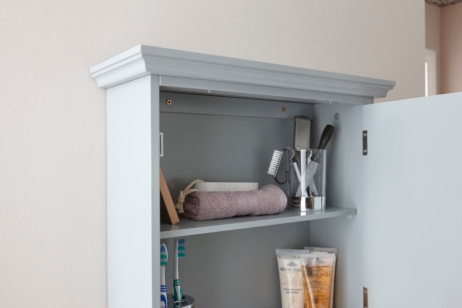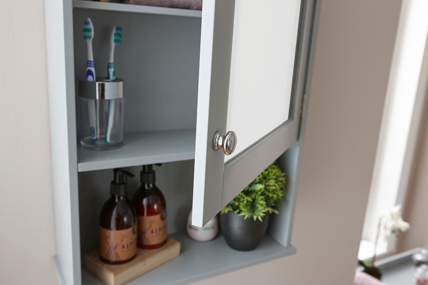A dual-purpose unit is always a smart choice. This Colonial Grey Mirrored Cabinet in grey is a clever over-the-sink storage solution, creating plenty of space for toiletries, while also providing a good-sized mirror that's a bathroom must-have. The mirror is inset into the cupboard door, behind which shallow shelves make a handy repository for make-up, shaving materials and fresh supplies of toothpaste and soap. The open shelf below makes a smart display area.