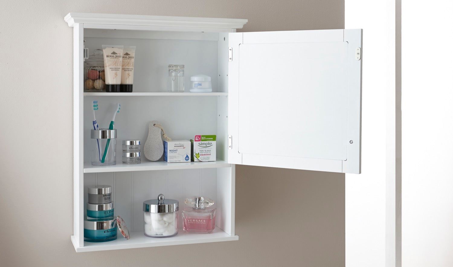 A dual-purpose unit is always a smart choice. This Colonial White Mirrored Cabinet in grey or white is a clever over-the-sink storage solution, creating plenty of space for toiletries, while also providing a good-sized mirror that's a bathroom must-have. The mirror is inset into the cupboard door, behind which shallow shelves make a handy repository for make-up, shaving materials and fresh supplies of toothpaste and soap. The open shelf below makes a smart display area.