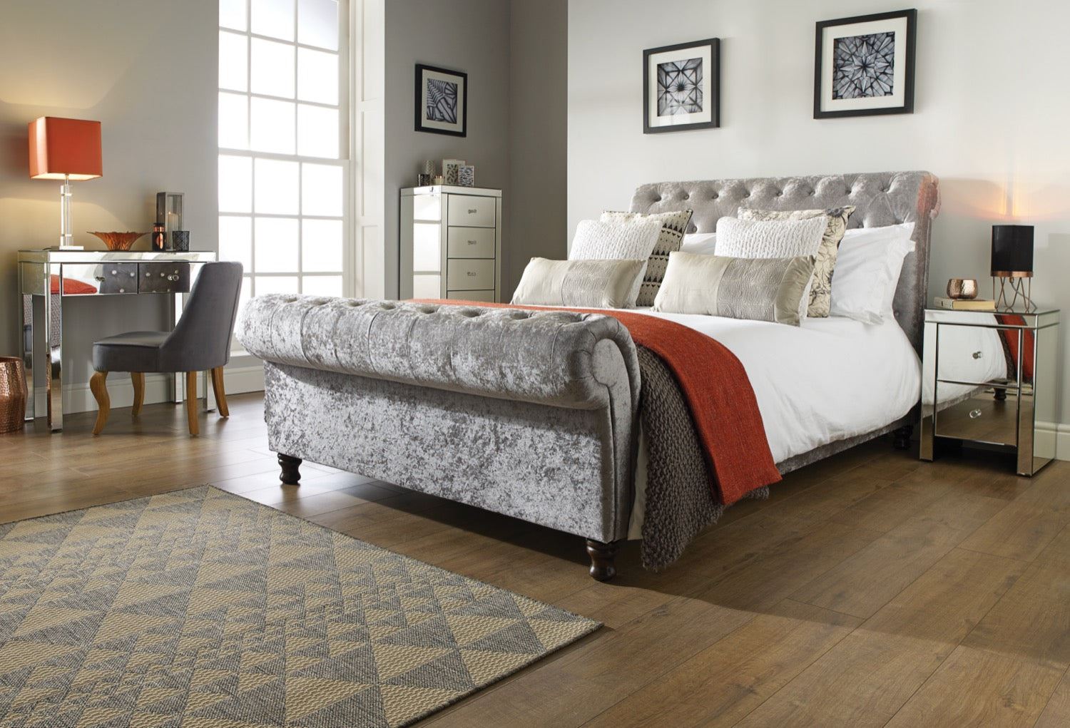 The clean, contemporary and chic Seville range will add a sense of elegance to any home. Constructed from a MDF frame this 2 drawer bedside features beautiful bevelled edges along with mock crystal handles. This versatile range will sit comfortably in a modern or traditional setting making this mirrored furniture a welcome addition to any home. This item comes pre-assembled for additional convenience and is part of a complete bedroom collection. Cleaning and Care: Wipe with dry cloth.