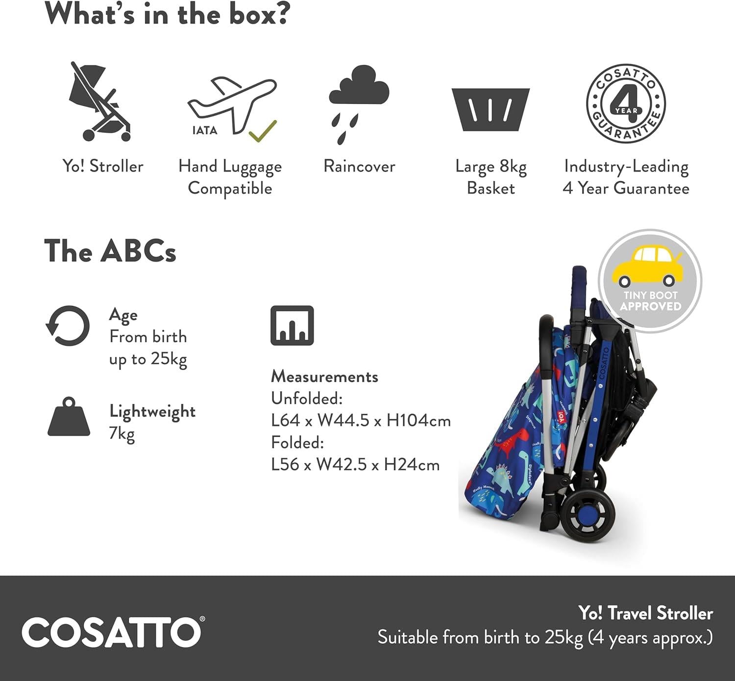 Passport, tick, Toothbrush, tick, Yo! Stroller, tick. The lightweight, airline compatible, ultra-compact stroller needs to be one of your holiday essentials this season. Get your little one to the airport gate with ease, perfect for exploring and suitable for everyday trips to the shops or park. Get set go with Yo! What's in the Box? Yo! Stroller 4 Wheels Raincover � Hopefully you never need it! Bumper Bar 4- Year Guarantee Card Set of instructions